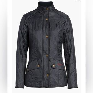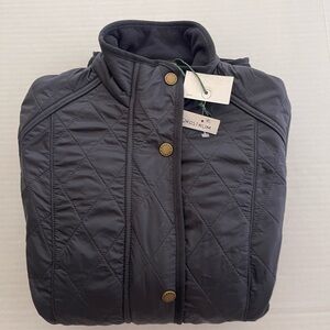 An equestrian-inspired jacket sporting allover Navy diamond quilting and a cozy fleece lining offers lightweight warmth without the bulk. An elasticized waist inset and dipped hem in back refine the silhouette.