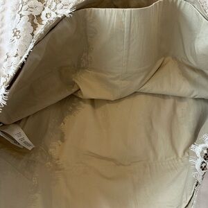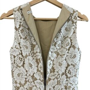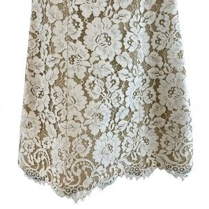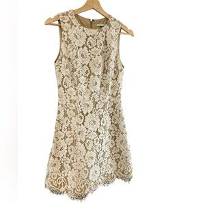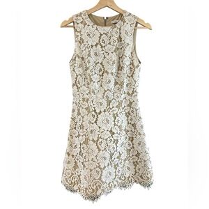 This is an Alice + Olivia Lace Shift Dress in the color Sand featuring a floral lace pattern and a fully lined with interior nude lining. Structured beautiful lace overlay perfect for weddings, bachelorette, parties, prom, formal events.