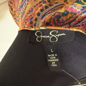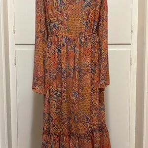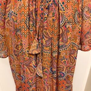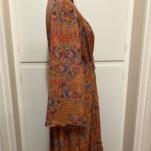 Stylish long sleeve kimono with paisley pattern. Features a vibrant orange color. Perfect for any occasion. Wear it tied at the waist or untied.