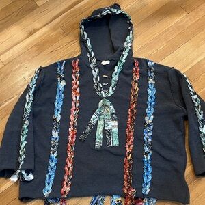 Unique hoodie with colorful braided designs. Features vibrant patterns on a dark base.