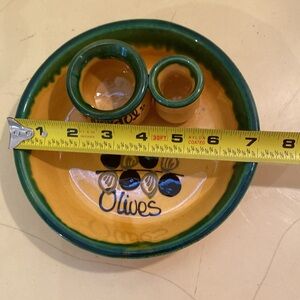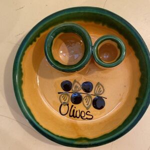 Vintage Hand Painted Ceramic Olive Dish w/Pitter & Toothpick Holder 7” Wide. Olive Green & Yellow.