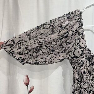 Elegant women's flowy dress featuring a black and white floral pattern. Perfect for any occasion. Brand is Anthropologie. Size Small. Bell sleeves and built in liner. 16” Pit to Pit.