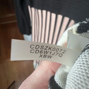 Sophisticated long sleeve dress with solid black bodice. Features vertical stripes in blush and black on lower portion. Round neckline adds classic appeal. Sleek design perfect for professional or evening wear.