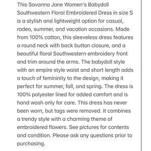 This Savanna Jane Women's Babydoll Southwestern Floral Embroidered Dress in size S is a stylish and lightweight option for casual, rodeo, summer, and vacation occasions. Made from 100% cotton, this sleeveless dress features a round neck with back button closure, and a beautiful floral Southwestern embroidery front and trim around the arms. The babydoll style with an empire style waist and short length adds a touch of femininity to the design, making it perfect for summer, fall, and spring. The dress is 100% polyester lined for added comfort and is hand wash only for care. This dress has never been worn, but tags were removed. It combines a trendy style with a charming theme of embroidered flowers. See pictures for contents and condition. Please ask any questions prior to purchasing.