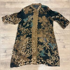 Elevate your bohemian wardrobe with this stunning Citron Santa Monica sheer burnout tunic, designed with a flowing, relaxed silhouette that works beautifully as a tunic top or kaftan-style dress. Set against a rich black sheer base, this piece features an intricate velvet devoré floral and bird pattern with elegant gold accents and subtle hints of blue, creating a luxe, artistic look.