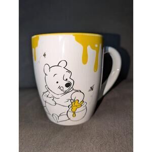 Disney white and yellow mug with a "Sweet As Can Bee" text and bee and honey pot graphic. Whimsical design with yellow rim and drips. Collectible item in good condition.