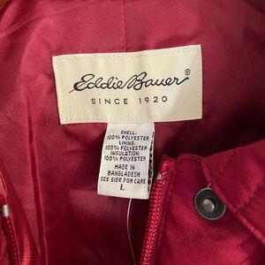 This is a brand new with tags Eddie Bauer women's large red quilted jacket/coat with a collar.