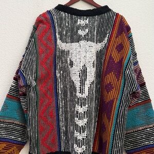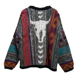 Vintage ALLEN WAH Western Aztec Skull Colorful Chunky Knit Grandpa Sweater XL