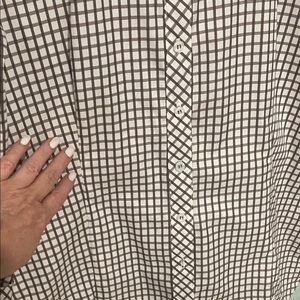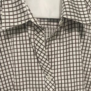 Stylish checkered tunic in colors, brown and white.. Features a classic open collar and button-down front. Button sleeves can be rolled up for varying lengths. Perfect for casual and for wearing inside or out. Very crisp and appearance. Flattering seems in front flare out ever so slightly.. scalloped shirttail hem with open vents. Very well constructed and barely worn. Approximately 21 inches pit to pit. Approximately 30 inches overall length to the bottom of the back hem. The front hem is about an inch shorter. This garment appears to be an excellent , like new, condition with no visible stains anywhere