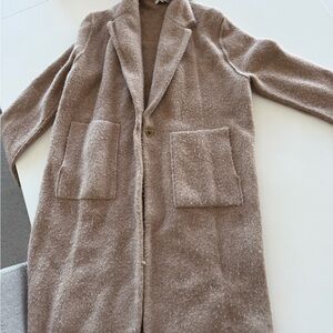 Vince Stylish long camel color cozy coat with large front pockets. Perfect for layering. Only used once. Because of fabric looks more worn than is