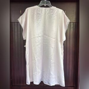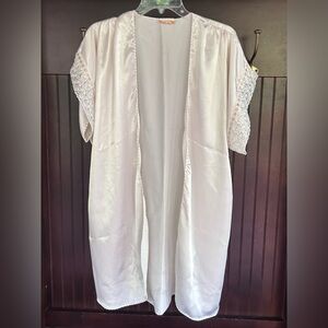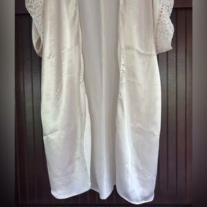 Elegant vintage satin robe by Val Mode, made in the USA with imported fabric. Features a soft ivory finish, open front design, and beautifully embroidered floral lace trim at the sleeves. Side loops are intact for a belt (not included). Lightweight, drapey, and ultra-feminine — perfect for lounging, bridal wear, or vintage lovers.