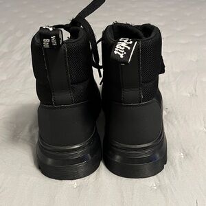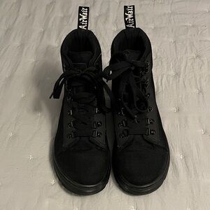 Black hardware on black canvas, these Dr Martens boots are a unique spin on the classic combat boot! In excellent condition, these MAY have been worn once, if at all. Thick tread. “Bouncing” insoles. Sure to last for years. And if you know Dr Martens boots, they only get better with time! Great deal and even nicer in person!