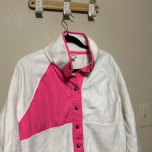 Stylish J. Crew jacket. Features pink and white color block design. Snap button closure. Perfect for casual wear.
