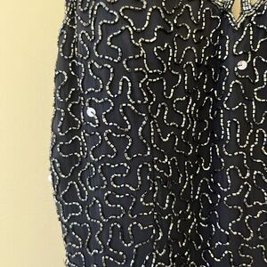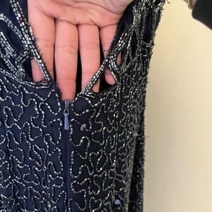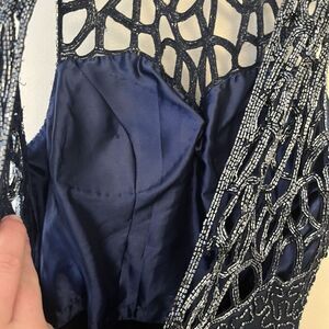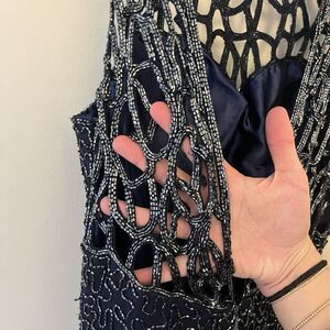 Vintage Scala Beaded Art Deco Sleeveless Navy Silk Formal Caged Yoke Dress