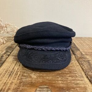 Stylish navy blue fisherman cap featuring braided detail, lace strip, and button accents. Perfect for a chic look.