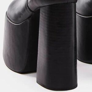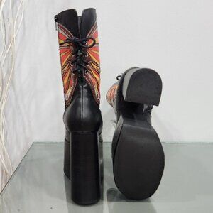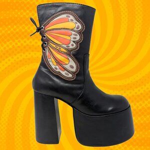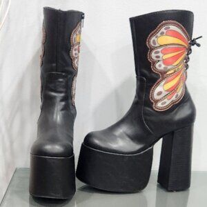 RARE FIND! Those are absolutely spectacular, fierce statement boots with tons of personality and style from Dolls Kill x Current Mood. It's one of those timelessly hot shoes that will create instant drama and transform any look. Totaly Studio 54 meets Club Kid stunners, a treasure you'll find yourself reaching for season after season! They are romantically girly and badass edgy-chic at the same time. Made from high-quality vegan leather upper (Polyurethane) and rubber sole. Features surprisingly comfy chunky sculptural 5.75" sky-heel and 3.25" platform, overall heigth 15". Desinged with GORGEOUS bright butterfly embroidery on each side in Brown, Gray, Yellow and Orange, giving serious 70s and Y2K vibes, black waxed adjustable lace closue on the back, and side zipper closure. They are super versatile. The sky is the limit for styling ideas. It will look equally amazing with Penny Lane coats and mini skirts for a boho-chic look as it is with dressy outfits.True to size 9. Exellent condition. Comes from a clean, smoke-free home.