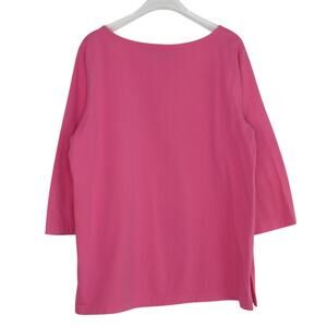 Bob Mackie A Walk in The Park Painting T-Shirt. Barbie Pink 3/4 Sleeve Crewneck Long Sleeve T-Shirt with Black & White Graphic Pattern of a Victorian Lady with an Umbrella in a Dress. Original Bob Mackie Artist Artwork Retro Casual Funky Art Shirt