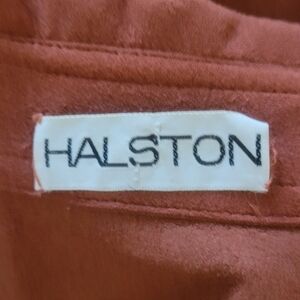 Excellent pre owned condition. 1970's Halston Burnt Rust Ultrasuede Button Front Trench Coat. Collared. Button Front. Button pleated cuffs. Side pockets. 22" pit to pit 45" shoulder to hem 21.5" sleeve length. Halston jeans also available in my closet.