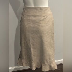 Elegant beige checkered pencil skirt with a charming ruffle hem. Ideal for both professional and casual settings.