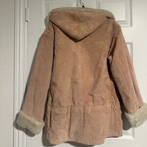 Stay warm and stylish with this elegant pink 100% genuine suede coat lined in cozy faux fur. With various deep pockets, adjustable waist, zip and clasps.