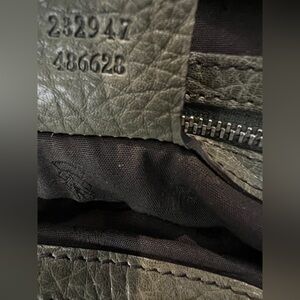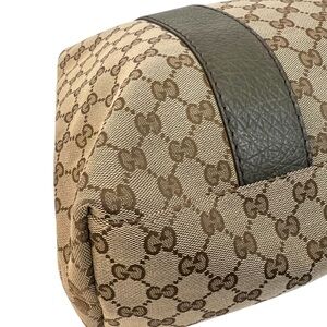 This is authentic, preowned with dust bag, Gucci Beige GG Canvas Bamboo Libeccio Tote Bag that is crafted of Gucci GG monogram canvas with green leather trim and braided leather strap top handles and silver links with a bamboo rod embellishment on each. The top is open to a fabric interior with zipper and patch pockets. The exterior canvas is clean and beautiful throughout with faint corner wear. Size is 15" x 5.5' x 11".