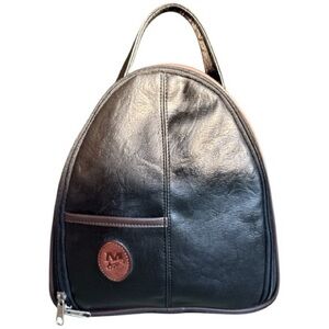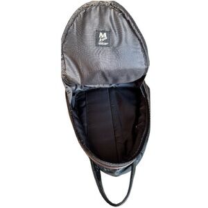 Black Mouflon Sac shoe bag in the style of a backpack. Front open pocket above the Mouflon label. Zipper bag opens to one compartment. Back of the bag offers an additional zipped pocket. Handle on top to carry. Brown ribbing accents the zipper, front pocket & back seam. Shoe separator in the middle that can fold down if you decided to use the bag for other purposes. Whether you are traveling across the globe or just packing for a weekend away, this shoe bag is an essential and provides so much style to the simple task of carrying shoes.