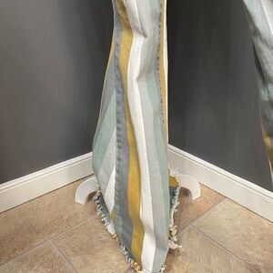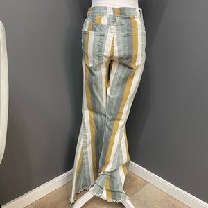 Stylish striped flare jeans featuring a blend of green, yellow, and white. Perfect for a bold fashion statement.
