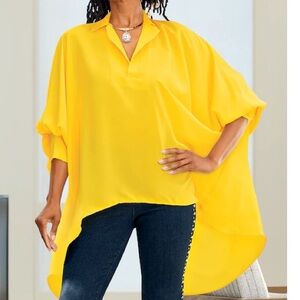 yellow high-low blouse, flowy tunic top, boutique resort wear, bright yellow top, dolman sleeve tunic, brunch outfit, golden essence blouse, vacation outfit women, summer chic top