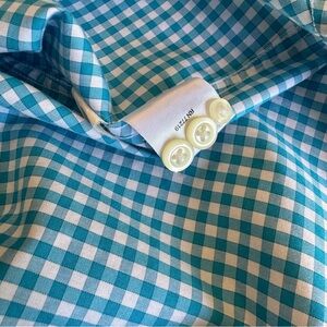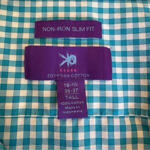 Wrap yourself in this luxurioius Egyptian cotton, soft to the touch. Egara Men's dress shirt. Non-iron. Slim Fit. Tall. Blue & white check pattern. Long sleeves, button up to the collared neckline. Slim fit sits close to the body with a straight silhouette. Cuffs offer two button closure options. Three extra buttons are attached to the inner tag, see last photo. Versatile shirt can be worn in any formal or business setting, ideal for travel given the non-iron qualities.
