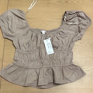 Discover elegance with this beige peplum blouse. Its flattering fit and stylish design make it a versatile choice for any occasion.