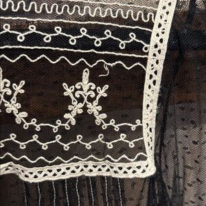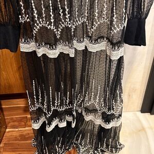 Like New. This elegant black and white dress features intricate embroidery, perfect for any special occasion. The sheer dress and detailed design add a touch of sophistication. PTP 17