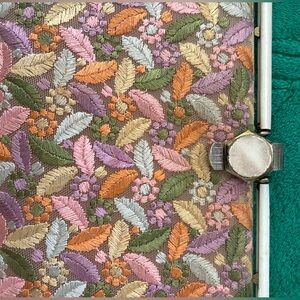 Beautifully bright and detailed tapestry purse in a classic early 60s design by Florsheim. Clasp closes very strong and firm. Unblemished tapestry all over. The handles are showing a slight bit of puckering, but considering the age of this iconic accessory, it’s in fantastic condition. Smoke and pet free home.