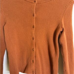 Stylish brown cardigan sweater. Perfect for layering. This is super stretchy, but also runs very petite. Marked as a Large, fits like a S/M