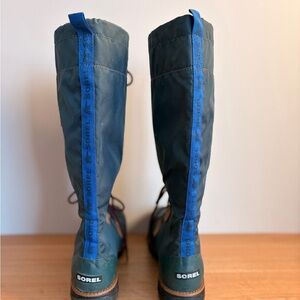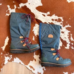 Sorel boots with dark green and blue exterior. Features orange toggles and red laces.