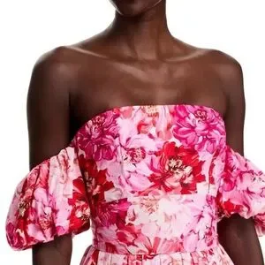 Chic strapless dress with vibrant floral pattern. Features a flowing silhouette and elegant design. Ideal for special occasions.
