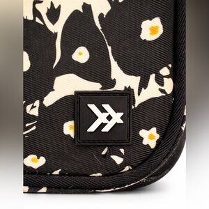 Thread black floral crossbody bag with adjustable strap and zip closure. Compact mini sling / fanny pack style bag designed to keep your essentials close on the go.