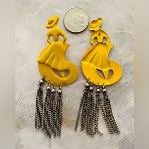 Vintage Yellow Figurine Lady Earrings with Silver Chain Tassels