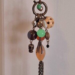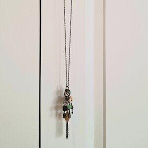 This long necklace features an eclectic mix of multi-colored beads and charms on an antique gold-tone chain. A perfect statement piece for any boho-luxe lover!