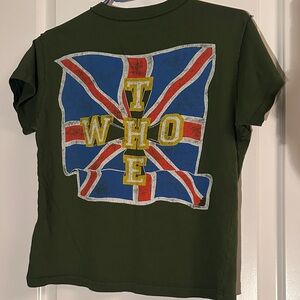 Bold The Who graphic on dark green. Features iconic British flag and lion design. Perfect for music lovers. I have no idea why this brand is so expensive but it is. Very well made 100% cotton.