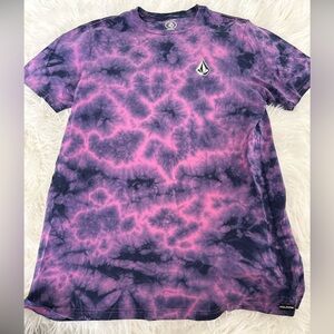 Stylish Volcom tee with pink and purple tie-dye. Modern fit with logo detail.