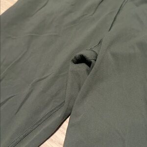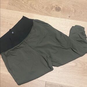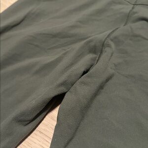 Green Lululemon workout leggings with ruching, cross waist, and pockets