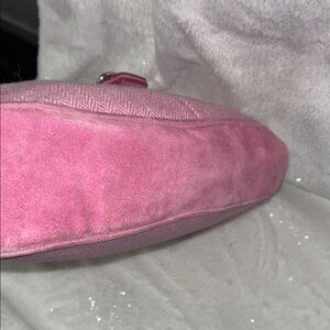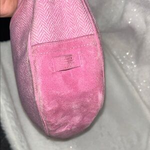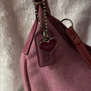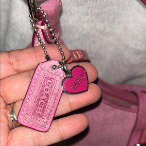 Vintage Coach with special heart charm hangtag and suede piping and handle. Elegant pink shoulder bag by Coach. Features stylish buckle accent and heart charm. Ideal for any occasion.
