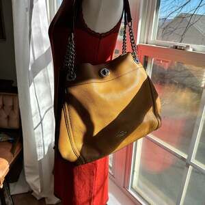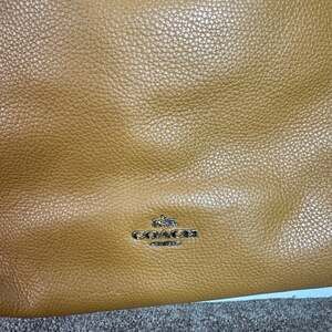 Coach Turnlock Edie Shoulder Bag in Light Saddle brown polished pebble leather. This classic silhouette combines effortless style with high-function organization.