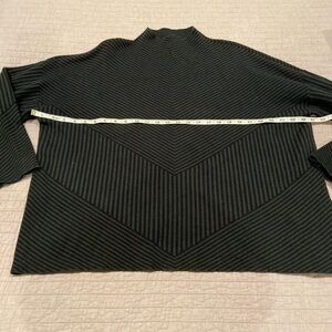 Chic and cozy Tahari sweater featuring a modern textured knit with a flattering chevron stripe pattern. Designed with a mock neck and relaxed fit, this piece is perfect for fall and winter layering. The subtle green and black color combo makes it easy to dress up or wear casually.