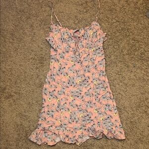 Charming pink sundress with floral print. Features a ruffle hem and spaghetti straps.