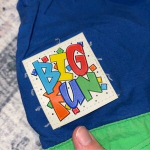 Vibrant color block design. Features playful patch. Ideal for fun activities.