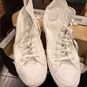 Stylish white canvas high-tops by Converse. Features classic lace-up style and signature logo patch.