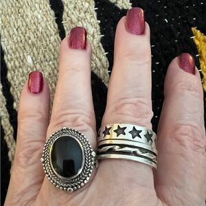 This vintage black onyx ring is crafted from sterling silver, indicated by its "925" mark, and weighs 6.8 grams. The prominent feature is a large, oval-shaped black onyx gemstone set within an ornate bezel. The setting is intricately detailed with twisted rope or braid designs, small silver bead accents (also known as bobbles or dots), giving it a distinct Southwestern or boho-hippie aesthetic. The substantial design is complemented by its size, fitting a ring size of 5.5. The natural black onyx is durable enough for everyday wear and is often associated with strength and protection.