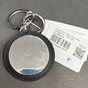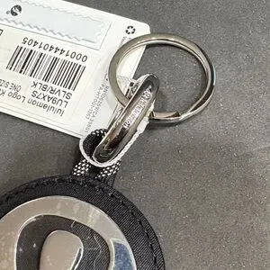 Stylish lululemon keychain with logo. Features black and silver design. Perfect for keys or bags. Plastic protector still on front and back.