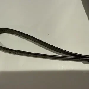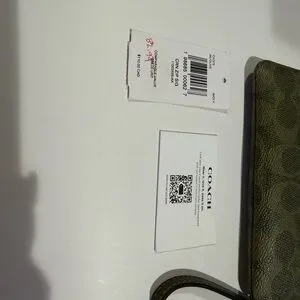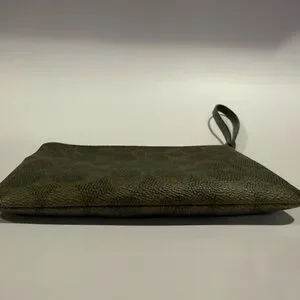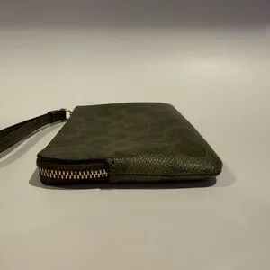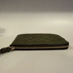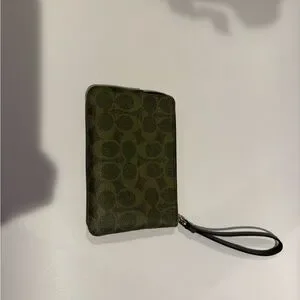 Elegant Coach wristlet in olive green. Features a sleek black strap. Ideal for essentials.